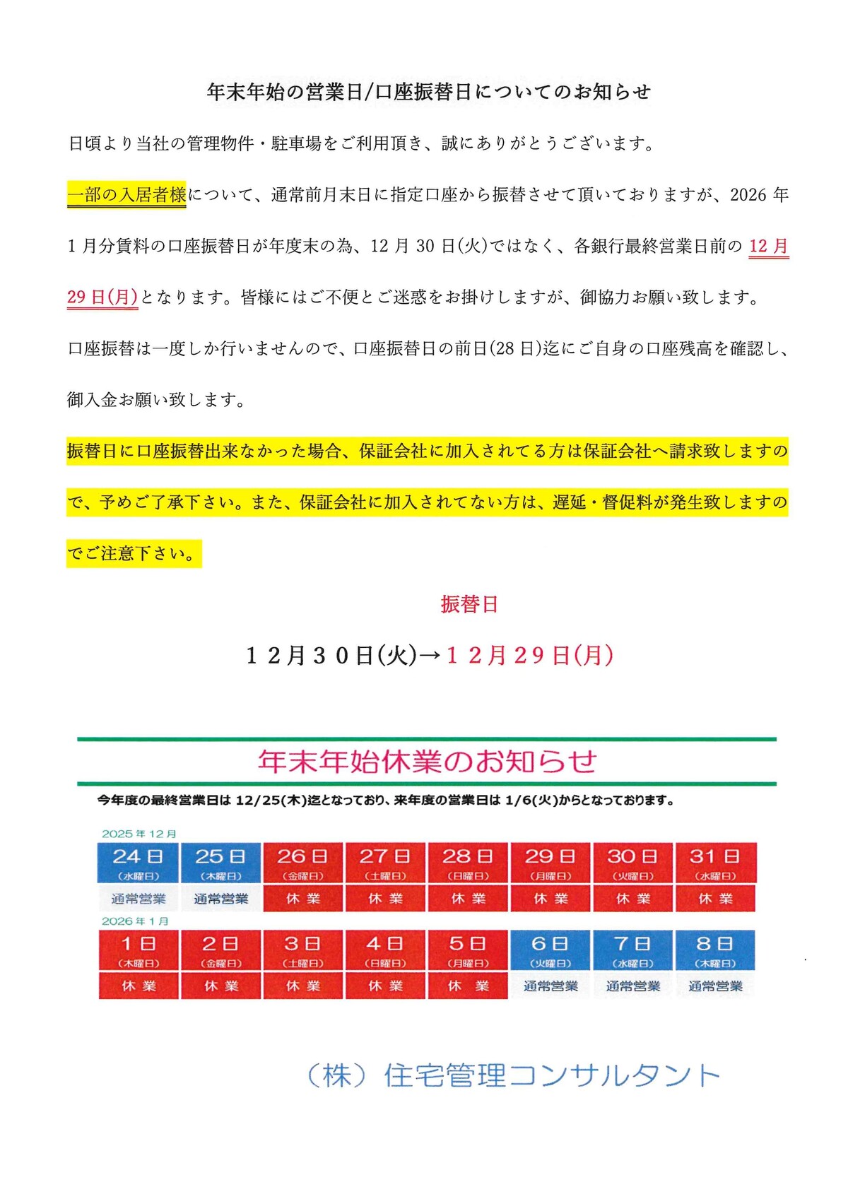 年末年始の営業日/口座振替日についてのお知らせ